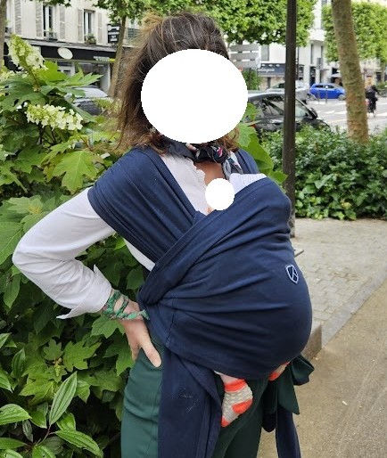 Le portage ergonomique l’appui est entre les jambes, le bébé a souvent les jambes tendues, le portage peut se faire face au monde très tôt