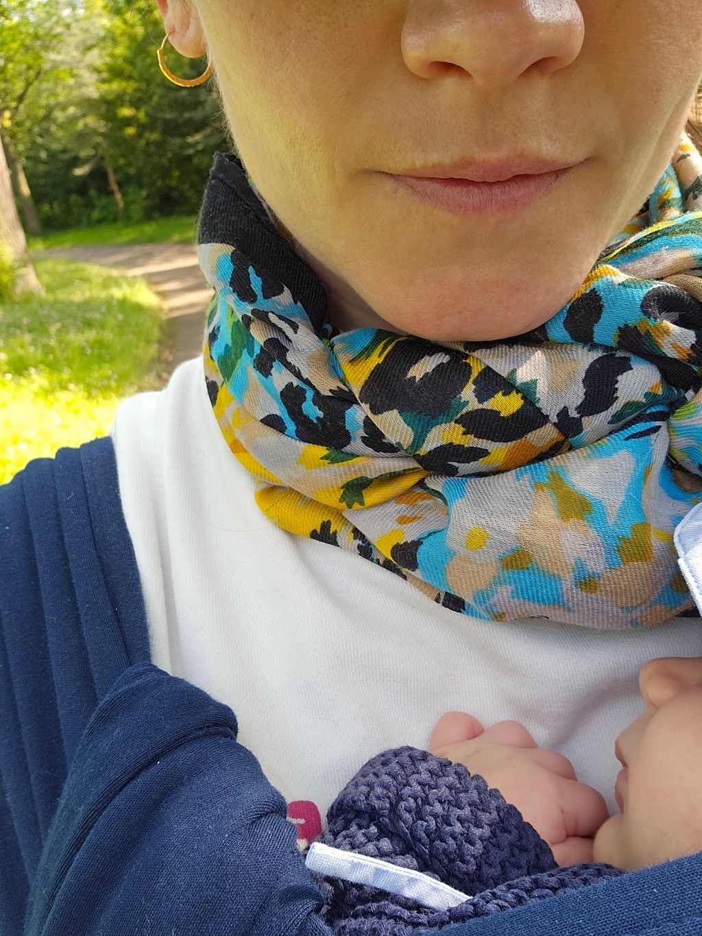 - les écharpes de portage tissées ou tissus stretch (se détend + vite) tissus qui se croise dans le dos = meilleur maintien pour le porteur et moins de tension sur les épaules qu’un porte bébé physio
