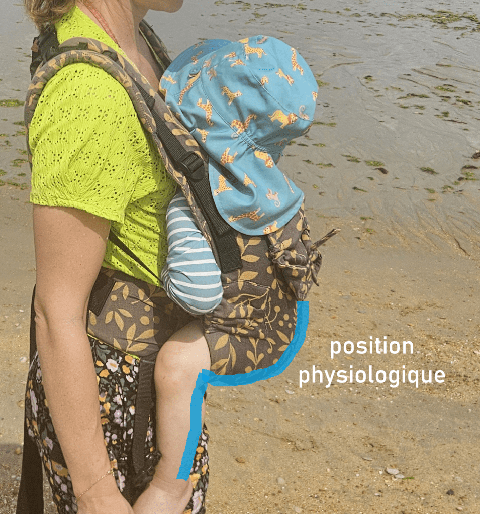Le portage physiologique est celui qui se rapproche le plus possible de la position du nourrisson dans le ventre, elle permet un enroulement de la colonne vertébrale, une position des jambes en W , un appui sur les fesses.